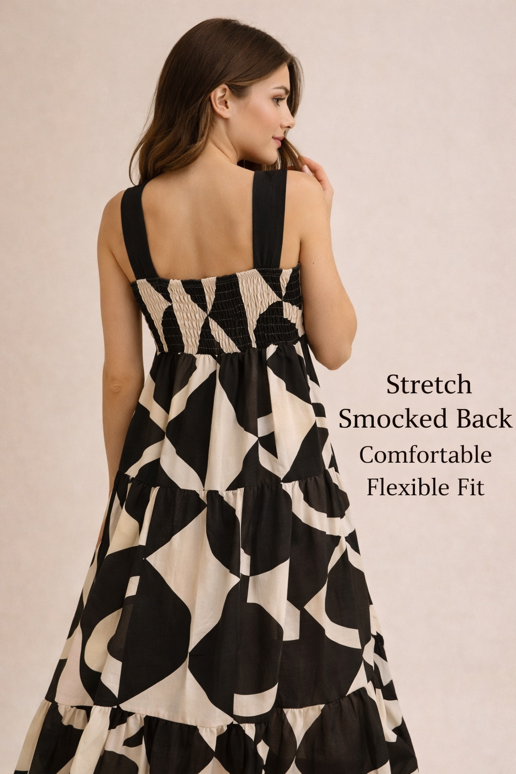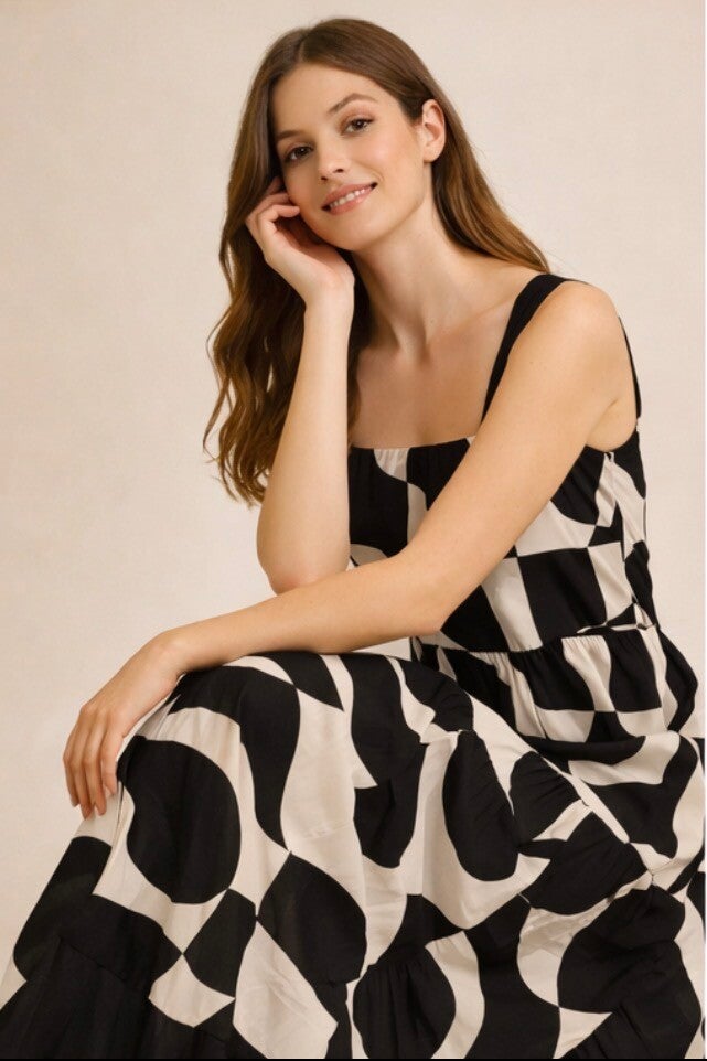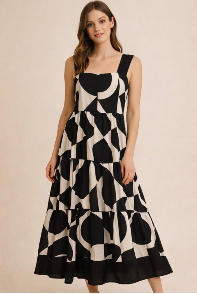 A stunning maxi dress that artfully blends bold geometric design with effortless grace.