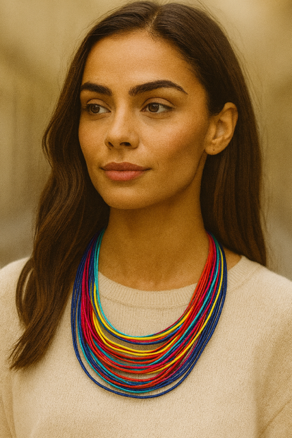 A multi-strand statement necklace designed to elevate any look. Crafted in a deep sapphire blue, this bold yet elegant piece adds a touch of modern chic to your everyday or evening outfits. Lightweight, flexible, and beautifully structured — the perfect accessory to enhance your feminine essence.