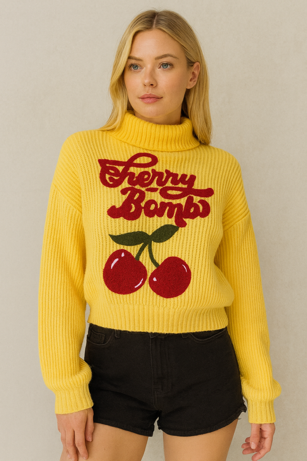 Crafted in a soft, warm ribbed knit, this vibrant yellow sweater features a charming “Cherry Bomb” graphic with textured cherry details that bring a fun and feminine touch.