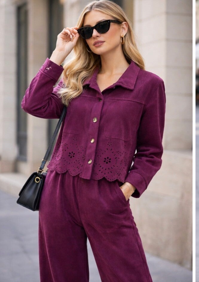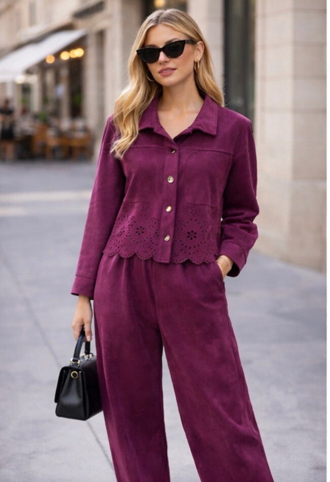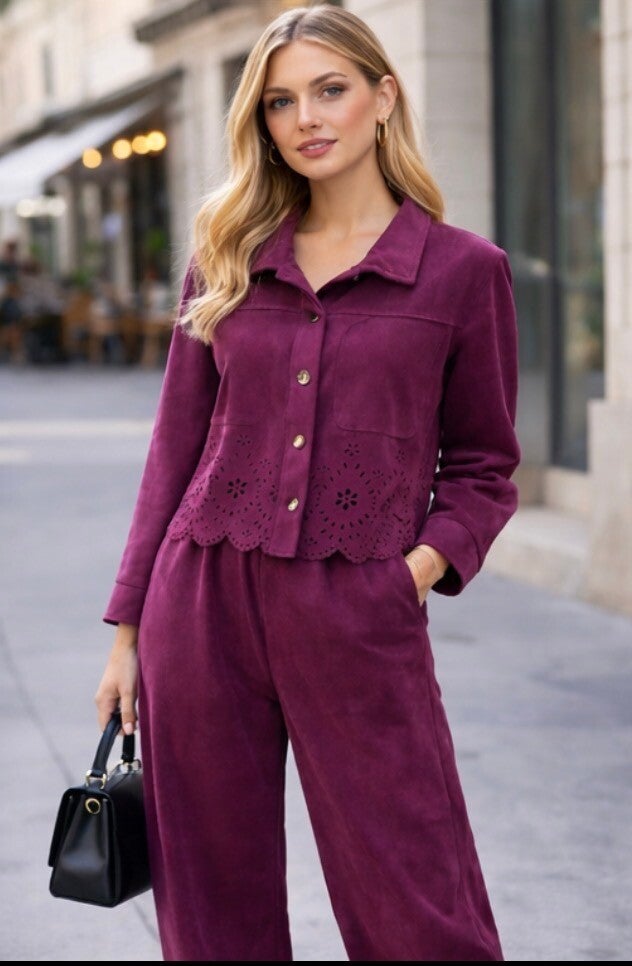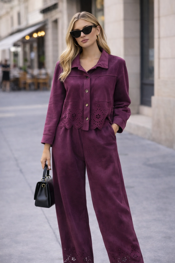 This chic ensemble features a soft velvet jacket with delicate decorative cut-out details paired with wide-leg pants that create a flattering, effortless silhouette.