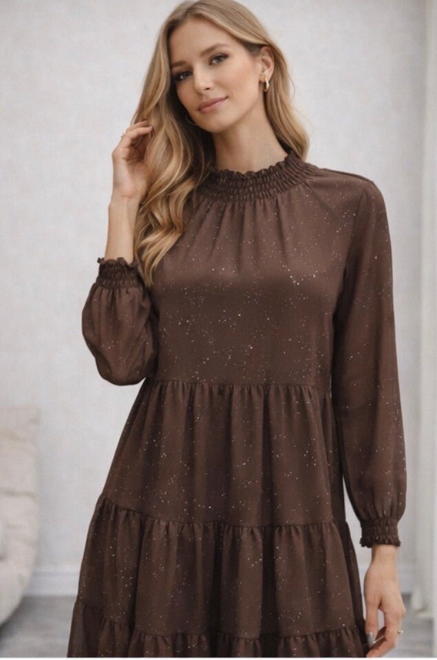 A chic statement dress designed to make you glow effortlessly. Featuring a flattering smocked high neckline, long sleeves, and a tiered ruffle silhouette, this piece blends elegance with comfort. The subtle shimmer detail adds the perfect touch of glam for dinners, special occasions, or elevated everyday looks.