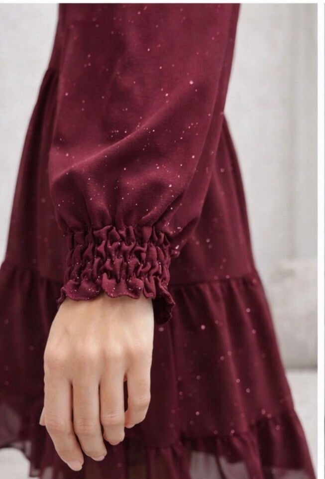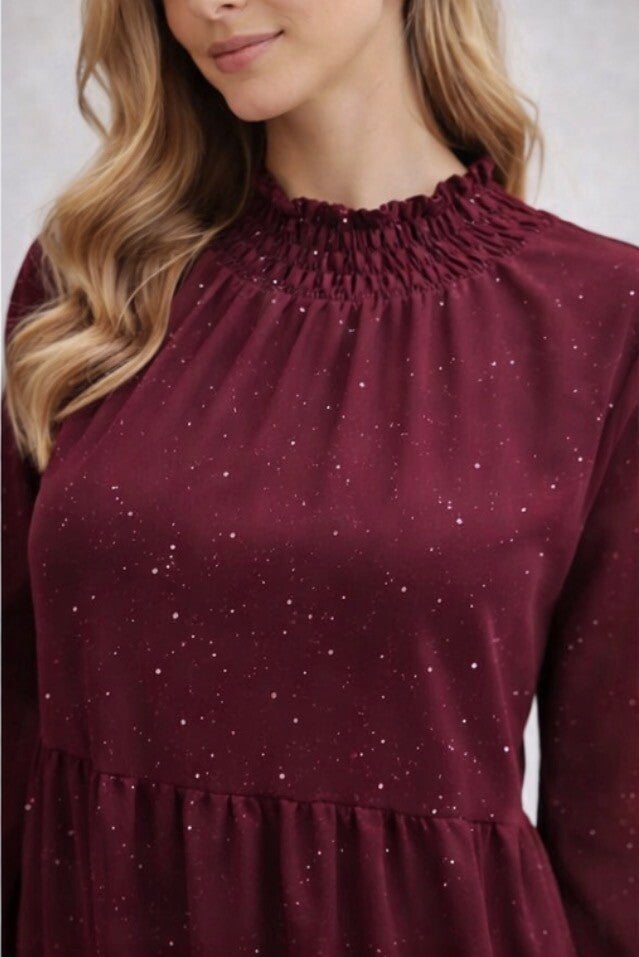 Burgundy Shimmer Tiered Mini Dress – Long Sleeve Smocked Neck
