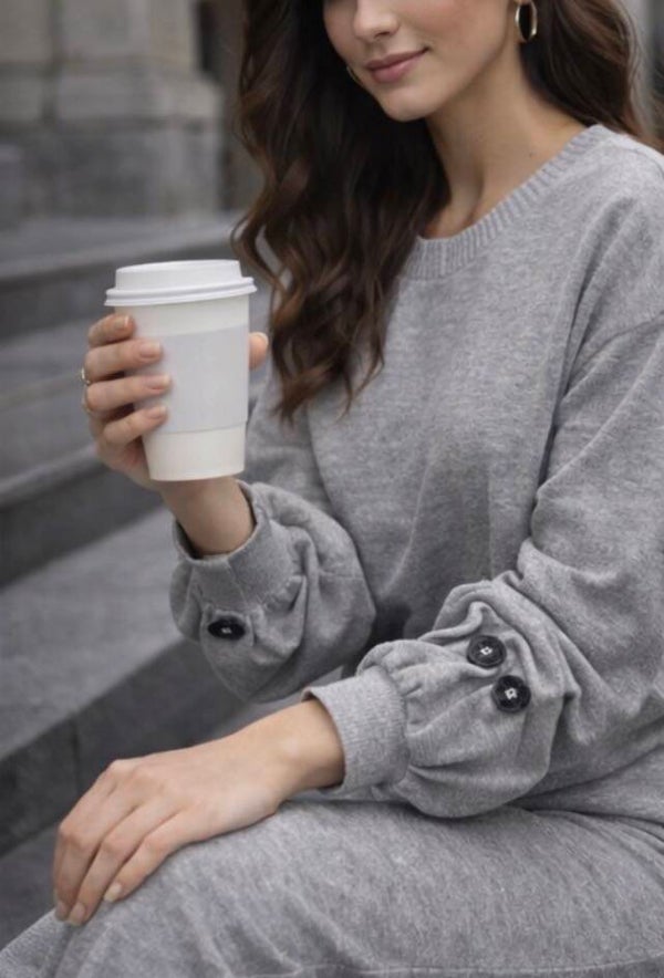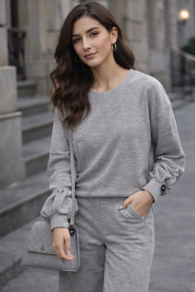 The sweater features statement balloon sleeves with an elegant button detail at the cuffs, giving this cozy outfit a refined, elevated look. The matching pants come in a flattering wide-leg fit, making it both comfortable and stylish.