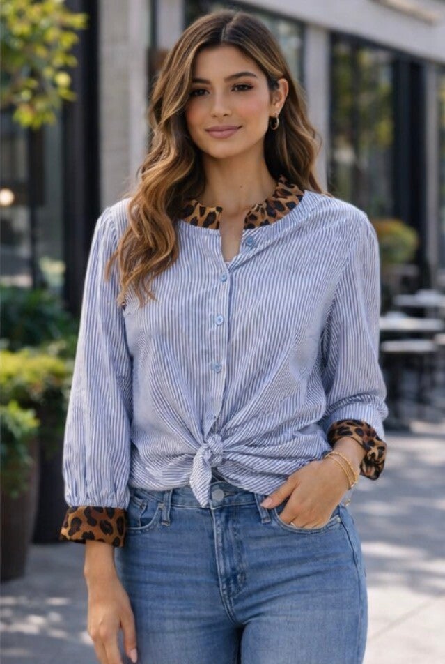 The soft vertical stripes create a flattering silhouette, while the animal-print details add personality and fashion-forward edge. Wear it loose, tucked in, or tied at the front for a relaxed yet polished outfit.