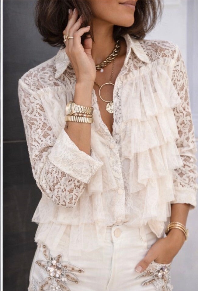 A romantic white lace blouse designed to elevate your everyday style.
