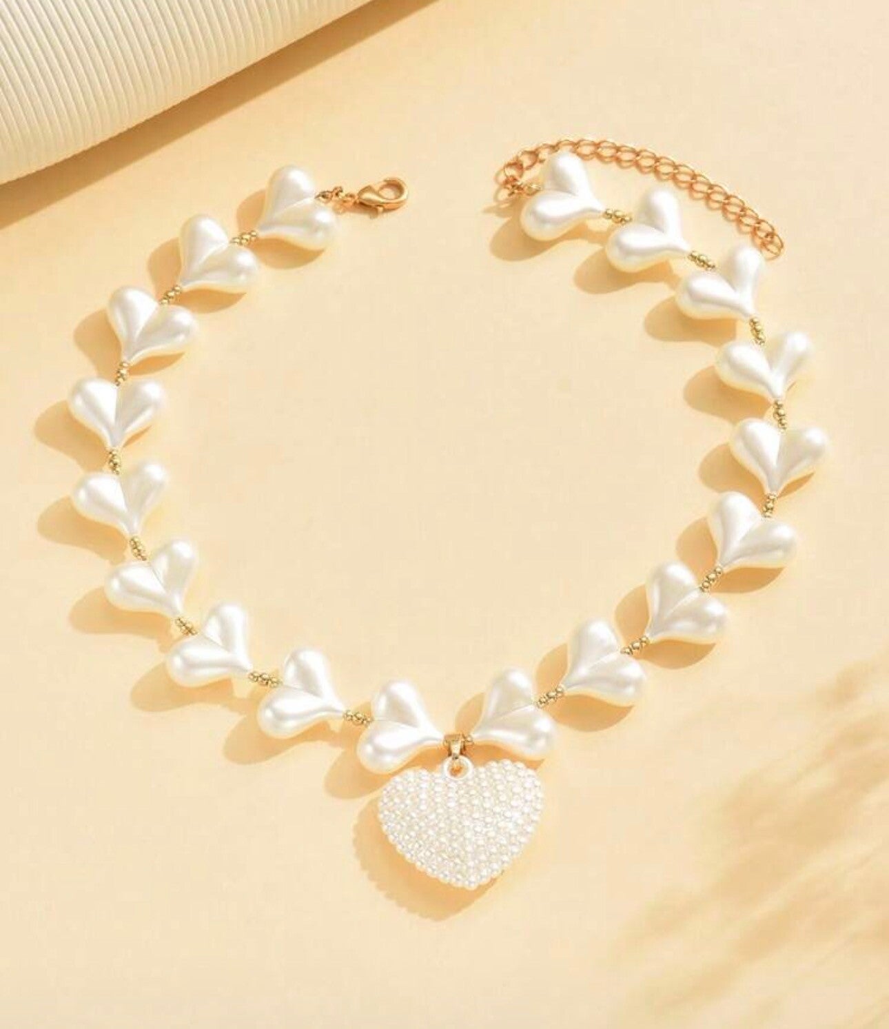 This stunning heart necklace features luminous pearl-style heart beads delicately linked with gold accents, finished with a textured pearl heart pendant that captures the light beautifully. It’s the perfect statement piece to elevate any outfit — from a simple black dress to a soft summer look.