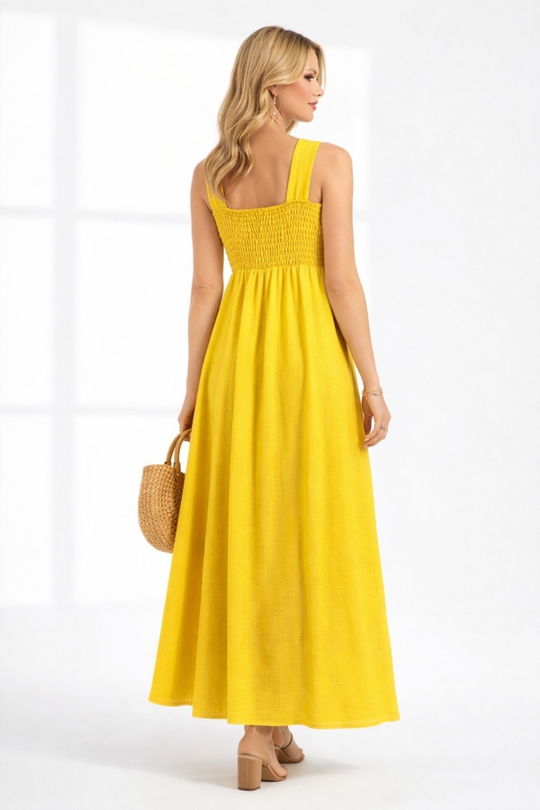 This beautiful yellow maxi dress is designed to combine comfort and feminine style. Featuring wide straps and a smocked elastic back, it offers a flexible and flattering fit while maintaining a sophisticated silhouette.